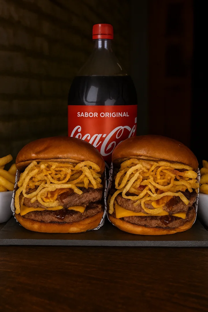 Pão Fofinho da casa, 2 burgers grelhados, 2x cheddar amanteigado, cebola crispy produzida aqui na casa, maionese de bacon e molho barbecue. Acompanha 2 fritas 100g + 1 coca 1L